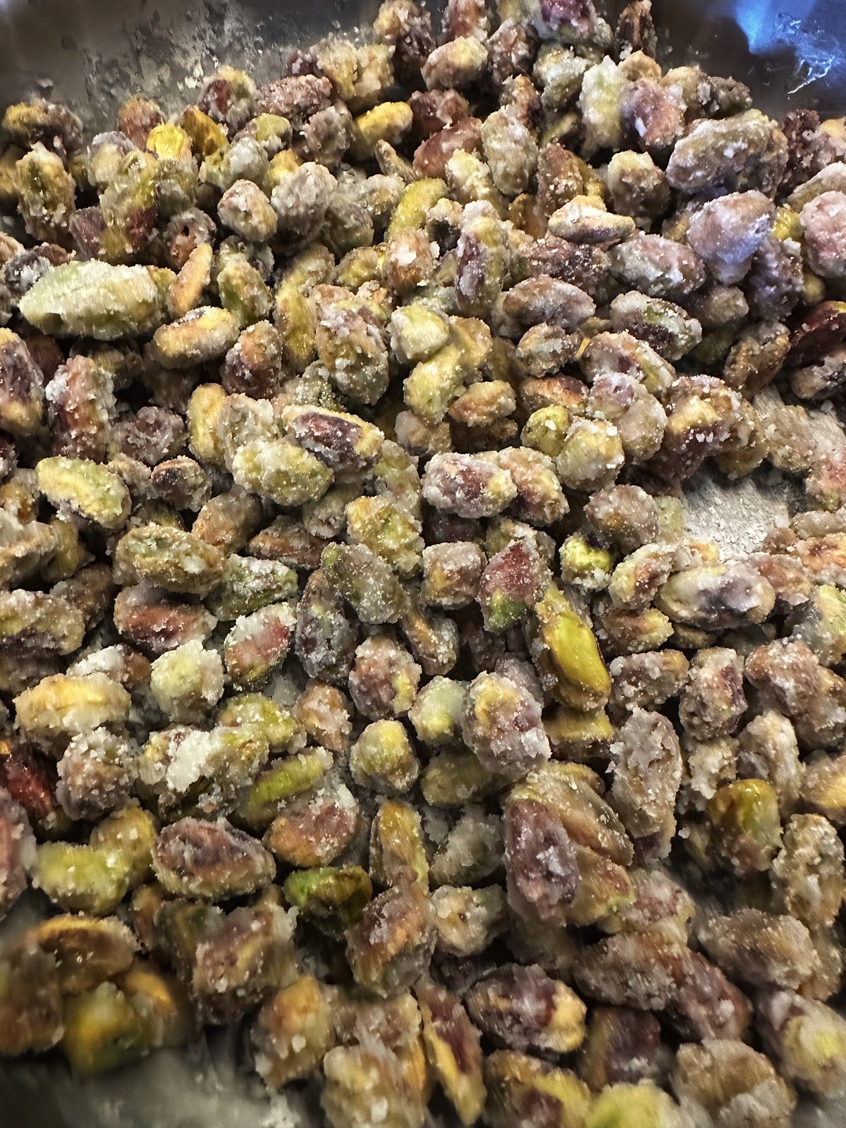 - When the mixture reach between 121 and 129°C, remove from heat and add the pistachios so that they are covered with that grainy sugar texture. (the temperature reached allows the sugar to dissolve and crystallise around the pistachios) here we don’t want a caramel which could overpower the delicate flavour of the pistachio, we want the sugar to crystallise around the nuts.